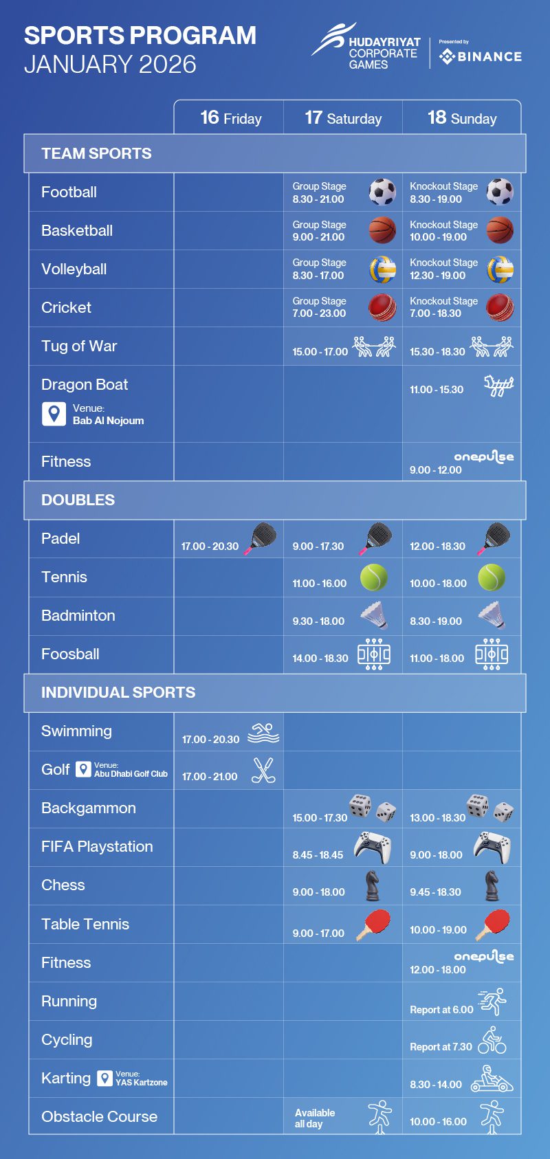 The main venue for the Hudayriyat Corporate Games is 321 Sports on Hudayriyat Island in Abu Dhabi. In addition to 321 Sports, there are two satellite venues, one for the karting competition and one for the golf competition.